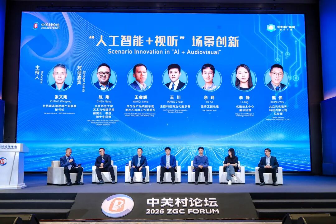 世界超高清视频产业联盟秘书长张文刚主持圆桌对话环节,北京师范大学艺术与传媒学院副院长、教授、博士生导师陈刚,华为光产品线副总裁、地水AItoH工作组组长王金辉,生数科技商业化副总裁王川,爱奇艺副总裁余珂,优酷技术中心副总经理李静,北京元客视界科技有限公司总经理熊伟共同探讨AI赋能视听产业的创新路径与未来前景。